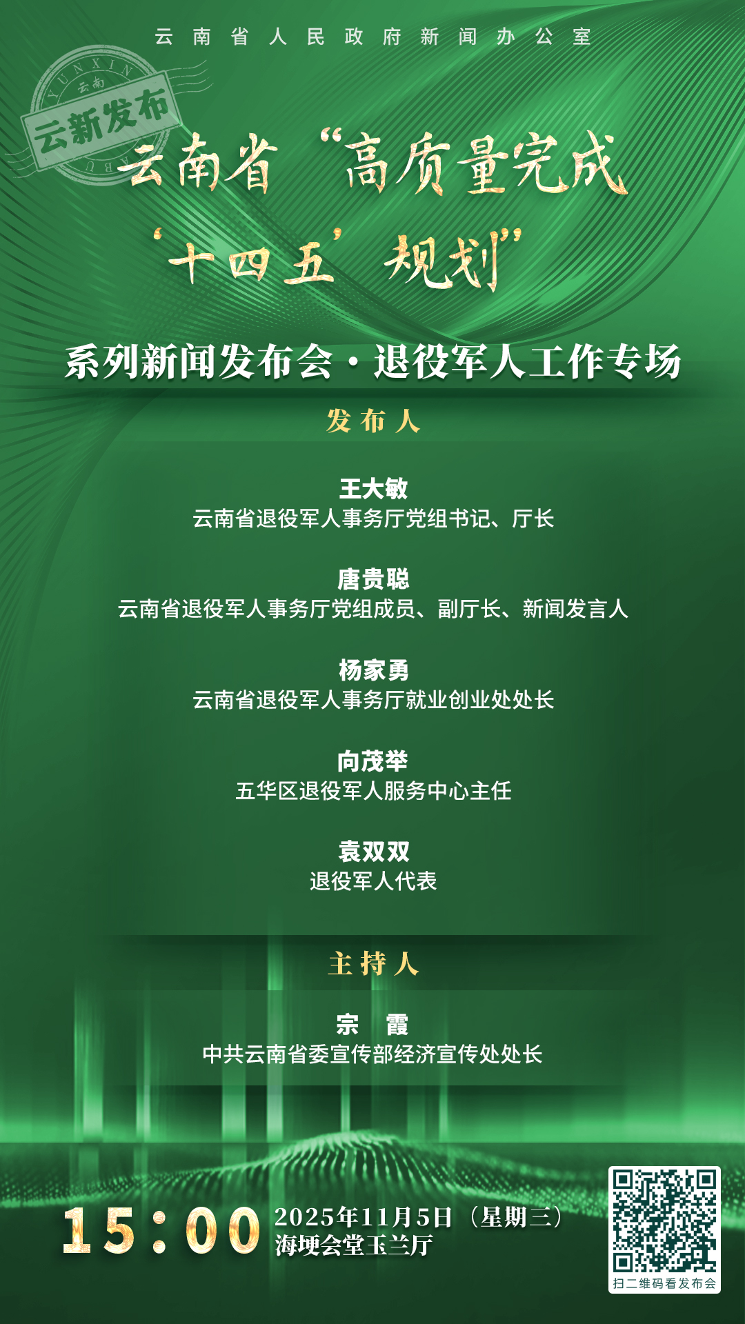 云南省人民政府新闻办公室定于2025年11月5日(星期三)下午3:00,在云南海埂会堂玉兰厅,举行云南省“高质量完成‘十四五’规划”系列新闻发布会·退役军人工作专场,省退役军人事务厅将介绍“十四五”期间云南退役军人工作情况并回答记者提问。