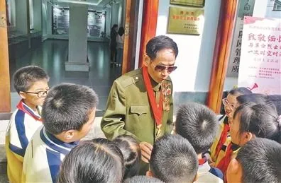 李绍天在腾冲市爱国主义教育基地给孩子们讲述战斗故事。
