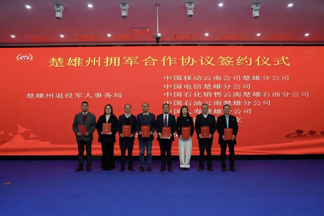 12月26日上午,楚雄州拥军合作协议签约仪式隆重举行。州退役军人事务局与中国移动楚雄分公司、中国电信楚雄分公司、中国石化楚雄石油分公司、中国石油楚雄销售公司、中国人寿楚雄分公司、人保寿险楚雄中支6家大型国有企业正式签署合作协议,推出涵盖通信服务、燃油供应、保险保障等多个领域的拥军惠军措施。