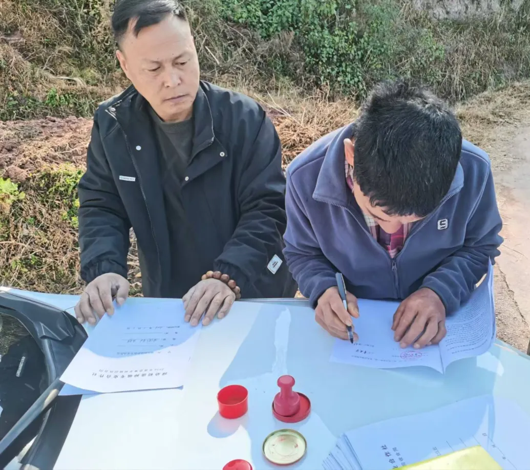 唐兴刚(左一),图为进村入户签订种养殖协议