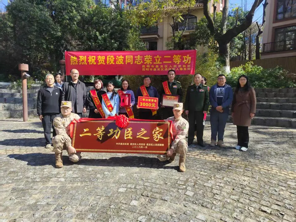 盘龙区人武部、区退役军人事务局、联盟街道办事处、金辰街道办事处及相关社区组成的送喜报队伍,带着满满的敬意与祝福,来到辖区荣立二等功、正规化建设先进个人的现役军人段波、李佩於家中,隆重举行送喜报仪式。
