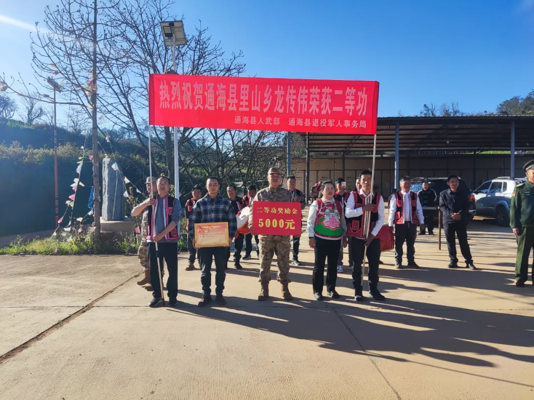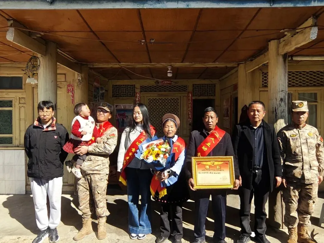 通海县人武部、县退役军人事务局、里山乡组成慰问组前往里山乡芭蕉村,为荣立二等功的现役军人龙传伟家庭送上立功喜报,共同见证这份属于军人家庭的荣耀时刻。