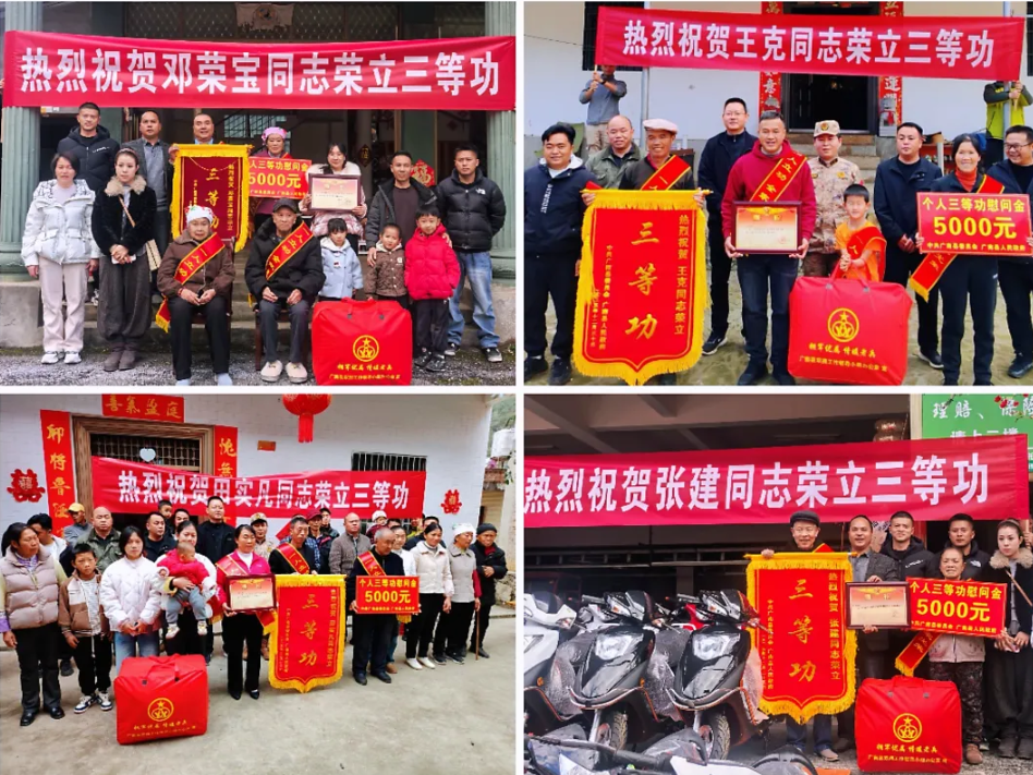砚山县退役军人事务局联合县人武部及稼依镇、维摩乡、者腊乡、八嘎乡人民政府,在众乡邻和亲友的见证下分别为立功军人李虎、李进龙、卢康恒、张全飞的家属,隆重送上立功喜报与奖励金,在全县掀起一波拥军热潮。