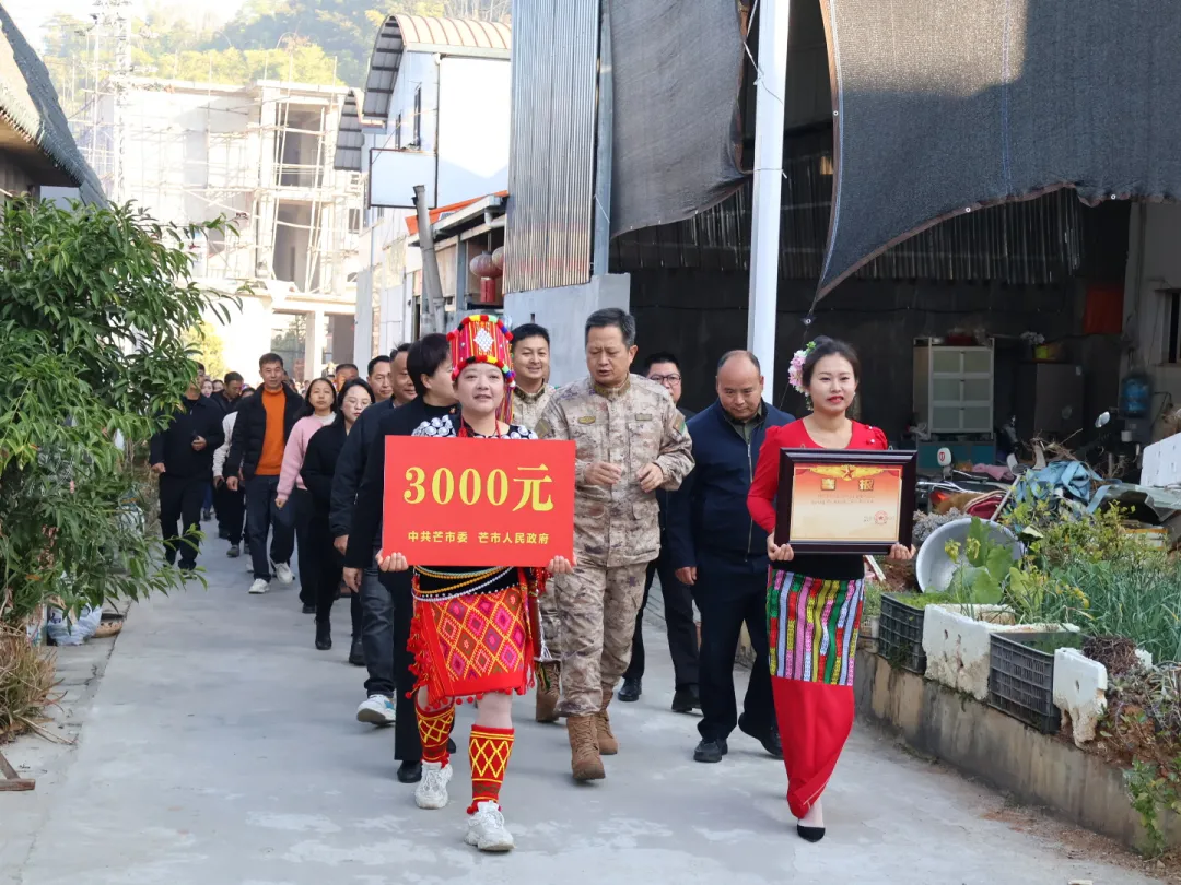 芒市人武部、市退役军人事务局、风平镇政府、市爱国拥军促进会代表等组成联合送喜报队伍,敲锣打鼓,前往风平镇黎明村现役军人杨卫高家中,将满载荣誉的立功喜报和慰问金送到其家人手中。