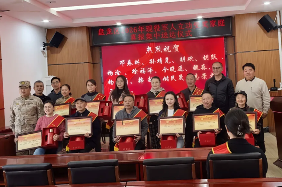 盘龙区隆重举行2026年现役军人立功受奖喜报集中颁发仪式,区人武部、区退役军人事务局、相关街道负责人为12位(1名二等功,11名三等功)立功受奖军人家属逐一颁发喜报和慰问品。