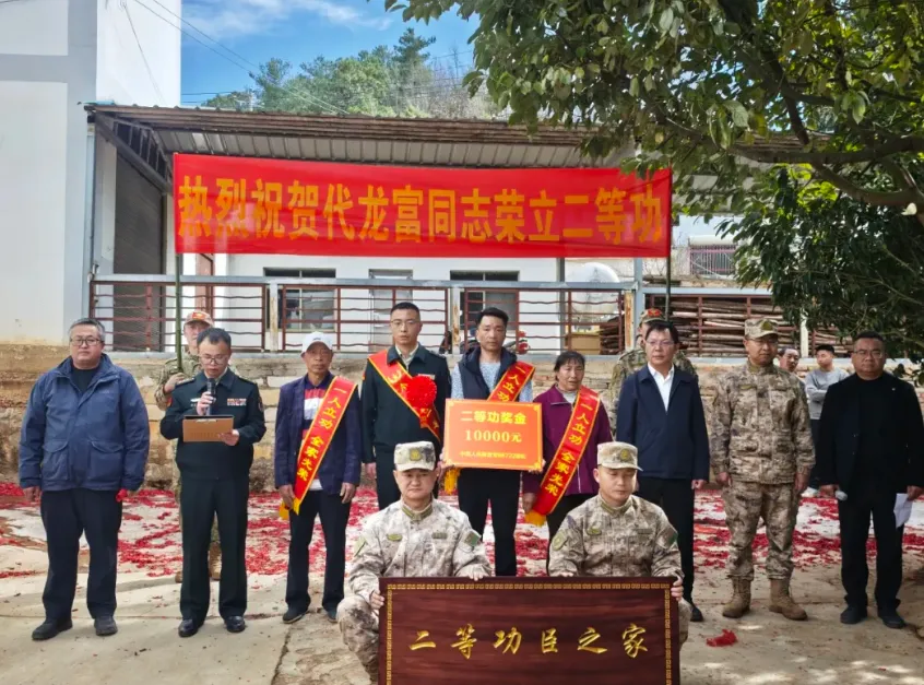 寻甸县河口镇联合县退役军人事务局、县人武部等部门组成送喜报队伍,为现役军官代龙富同志及家属送上二等功喜报、荣誉牌匾与慰问品,以隆重方式传递组织关怀,营造“一人立功、全家光荣、全社会尊崇”的浓厚氛围。