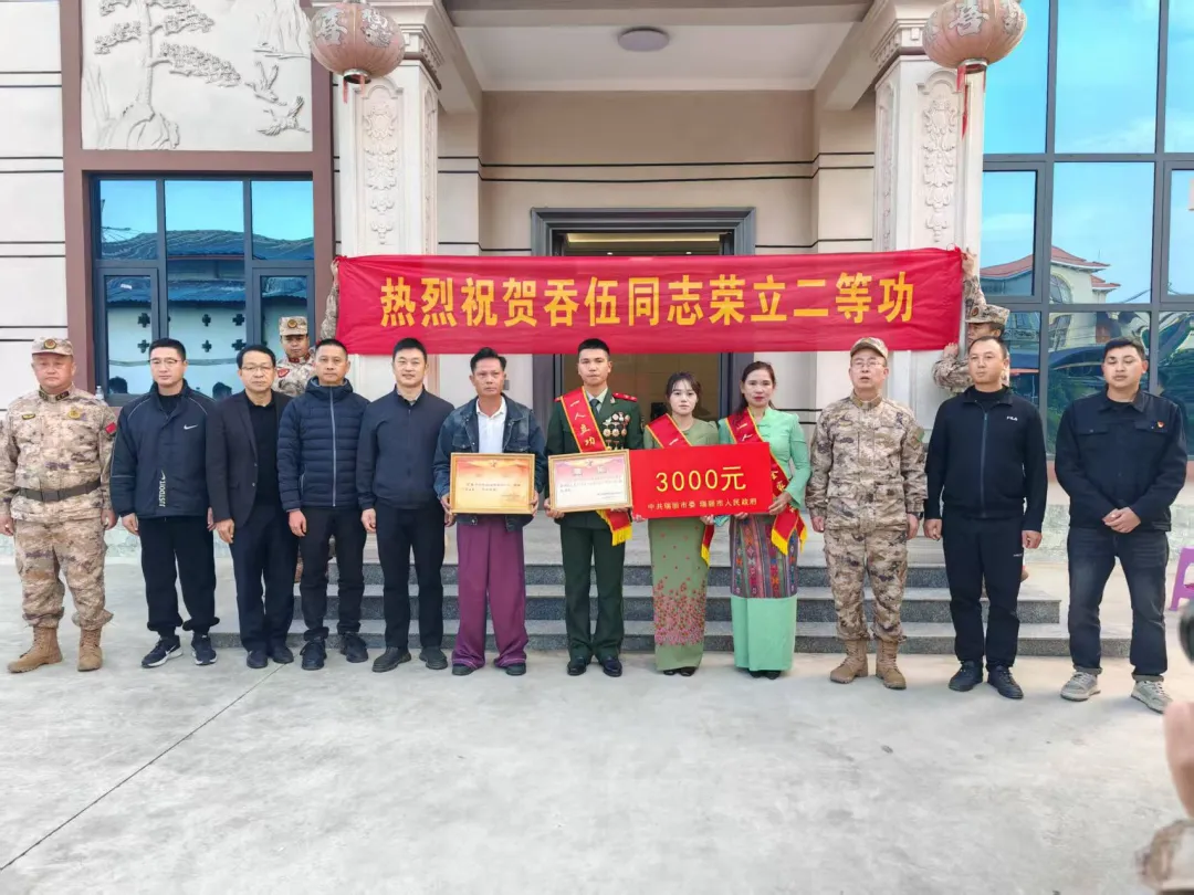 瑞丽市退役军人事务局、市人武部联合相关部门开展喜报送上门活动。伴随着铓锣鼓声,送喜报队伍先后前往荣立二等功的现役军人吞伍和荣立三等功的现役军人陈国剑家中,将烫金喜报、慰问金逐一送到家属手中,并为家属佩戴绶带,将党和政府的关怀与社会各界的尊崇送到军属心坎上。