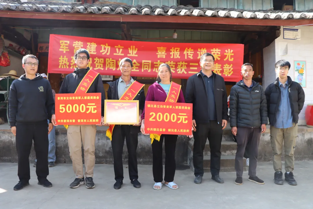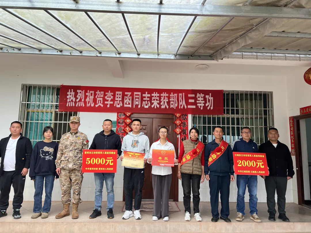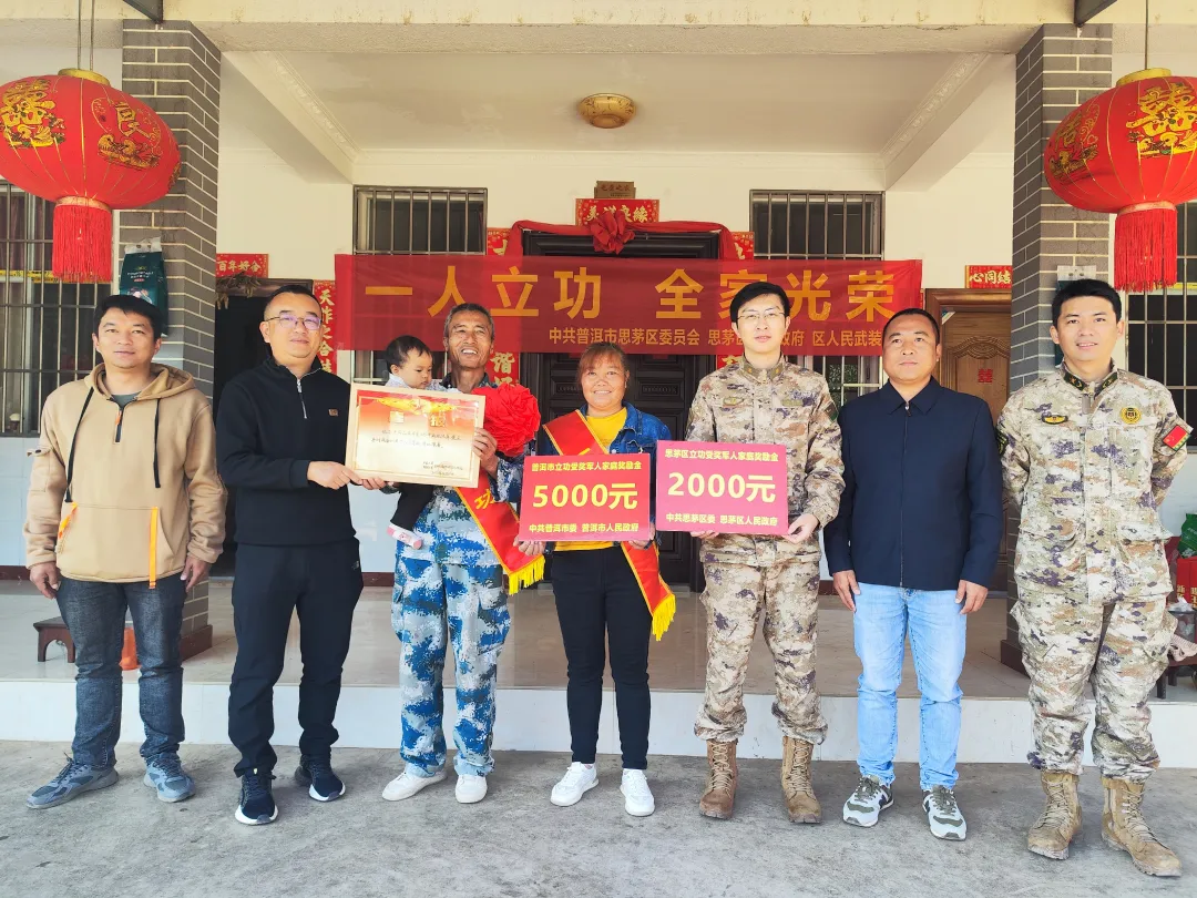 思茅区人武部、区退役军人事务局等多部门组成工作组,先后到李洋、孙运树、姚思杰3位荣立三等功的现役军人家中送上喜报和市、区两级奖励金,家属们脸上洋溢着自豪与欣慰的笑容,“一人立功,全家光荣”的良好风尚更加浓厚。