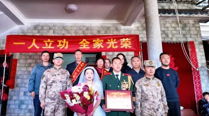 近日,在玉溪市华宁县,现役军人张晓军迎来了“双喜临门”——甜蜜的婚姻喜事与沉甸甸的三等功喜报同期抵达。华宁县退役军人事务局联合盘溪镇人武部组成送喜报队伍,带着荣誉和祝福,将三等功喜报送到了新人及家属手中,与他们共同见证这一荣耀时刻。一份喜报,是忠诚履职、担当作为的最好见证;一场良缘,是岁月温柔、相伴同行的人生圆满。