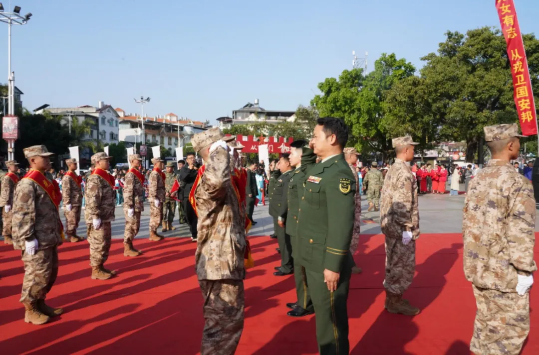 3月19日上午,芒市2026年上半年新兵欢送仪式暨“青春献国防 戎光耀故里”国防教育主题活动在芒市广场举行。出征仪式上,与会领导为新兵代表佩戴光荣花、赠送纪念品,勉励他们扎根军营、矢志报国,在强军征程中勇立新功、早传捷报。