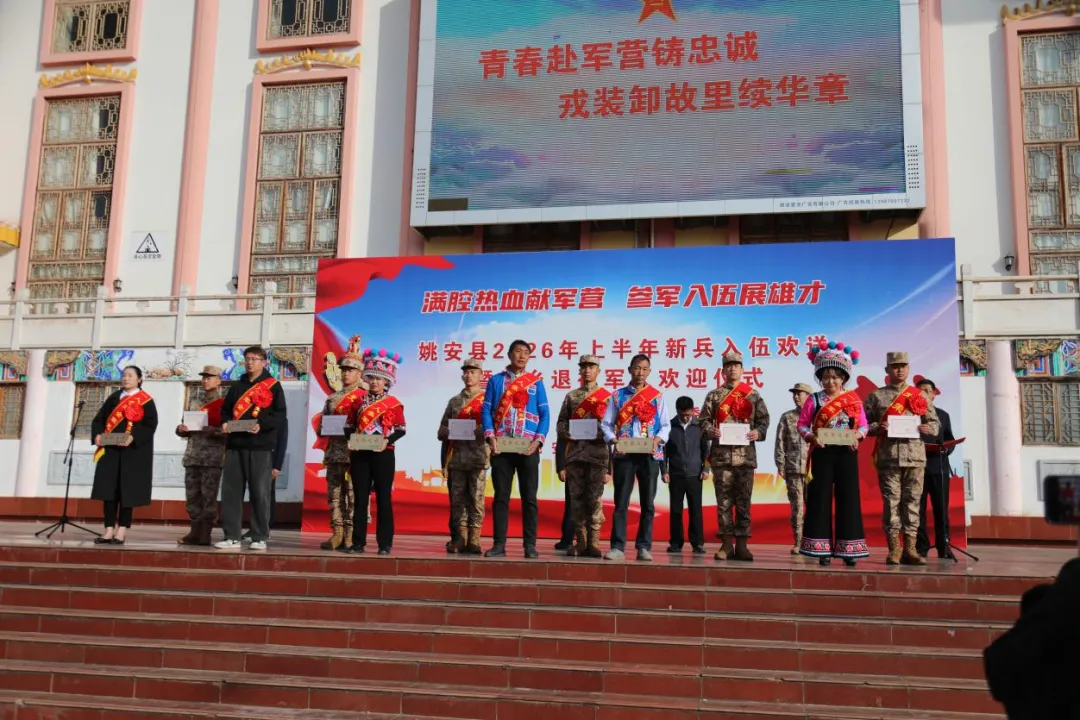 近日,姚安县举办2026年上半年新兵入伍欢送暨返乡退役军人欢迎仪式,并同步开展“光荣之家”光荣牌集中颁发活动。
