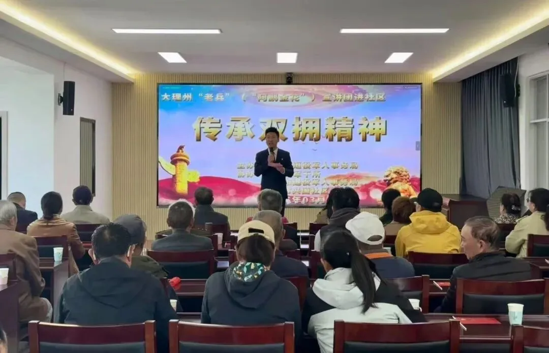 3月18日上午,大理州“老兵”(“阿鹏金花”)宣讲团2026年首场宣讲活动在大理市兴国社区举办。活动邀请大理州“老兵”(“阿鹏金花”)宣讲团成员赵利红、李升阳、张达诚、崔恩铭4位宣讲员以亲身经历和感人故事传承双拥精神,凝聚军民同心力量。