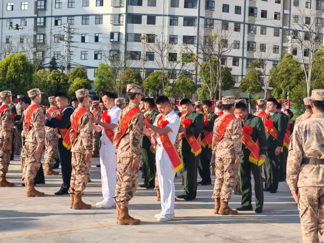 麻栗坡县在大王岩广场举行隆重仪式,欢送上半年新兵入伍、欢迎退伍老兵返乡。仪式现场,新兵、老兵同着戎装、胸戴红花,精神昂扬,洋溢着热血与温情。