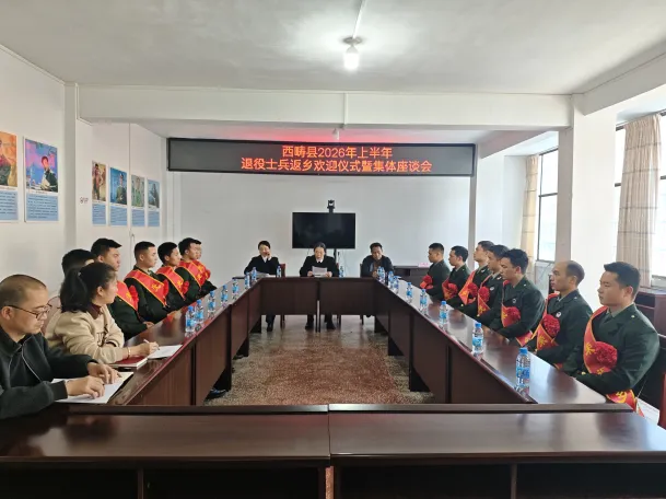 西畴县退役军人事务局举行2026年上半年退役军人返乡欢迎仪式暨座谈会,热烈欢迎21名退役军人载誉归来。局主要负责同志致欢迎辞,工作人员对移交安置、就业创业、优待证办理等政策作了详细解读。座谈会上,退役军人们交流返乡规划,并提出意见建议。活动最后举办了专场招聘会,助力退役军人顺利实现角色转换。